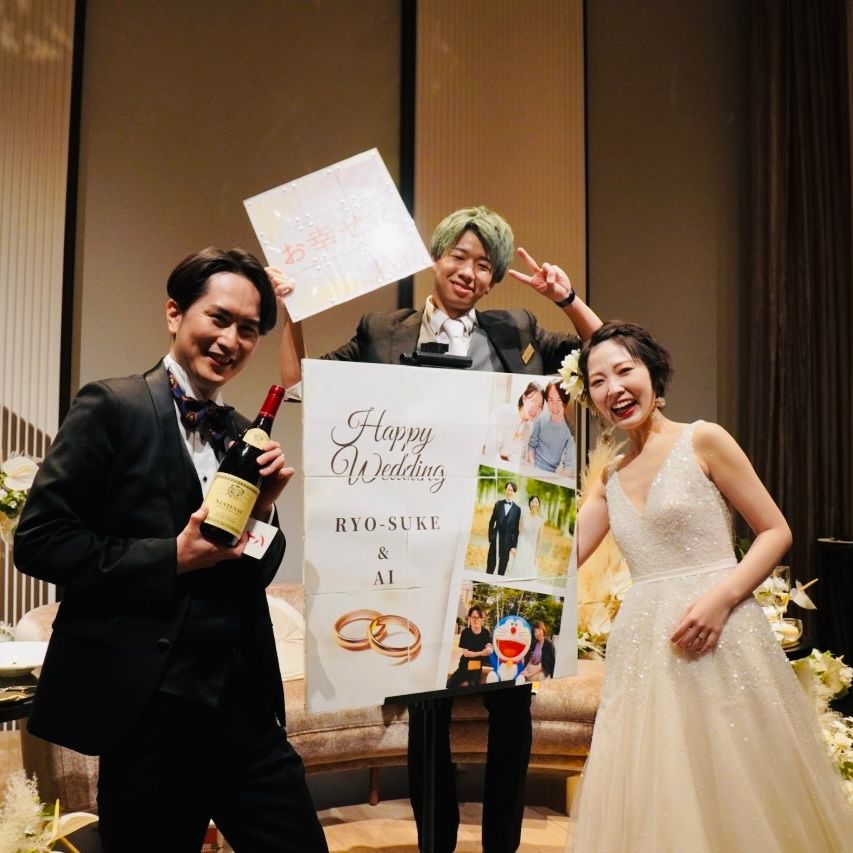 100名規模の式のため、道具も大きく派手な演出を多く行いました。最後はおふたりの写真のパネルが登場する演出を行いました。